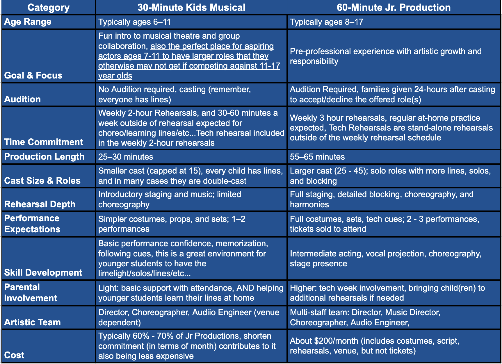 Lion King Kids is a 30-minute production focused on students ages 6-11. Jr show Productions are 60-minute productions focused on students ages 9-17. There are quite a few more important differences, please reference the table below. We also have videos of a recent Kids Production (Frozen) and a recent Jr production (Little Mermaid) below to help you get a visual of the differences.
