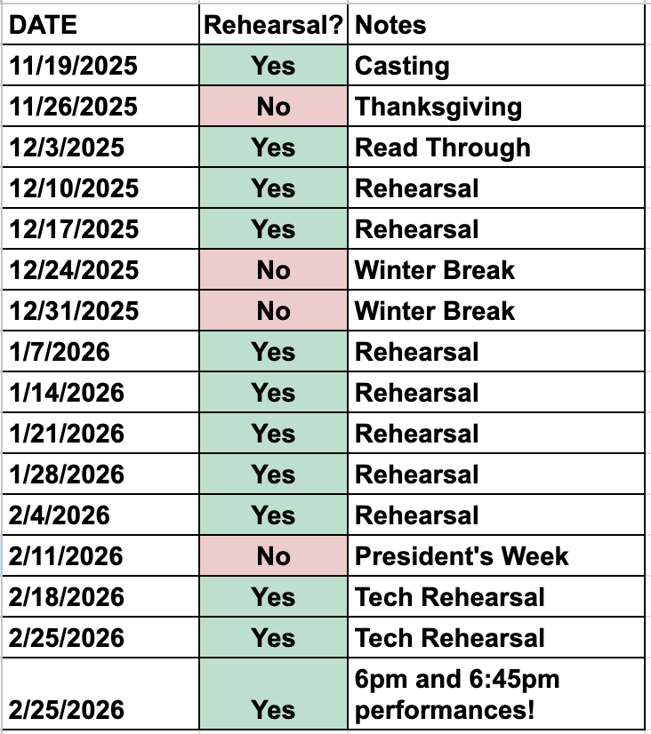 Please make sure your student(s) come to each rehearsal on time and attend the whole rehearsal. Students should arrive and leave each rehearsal with the following 5 THINGS: