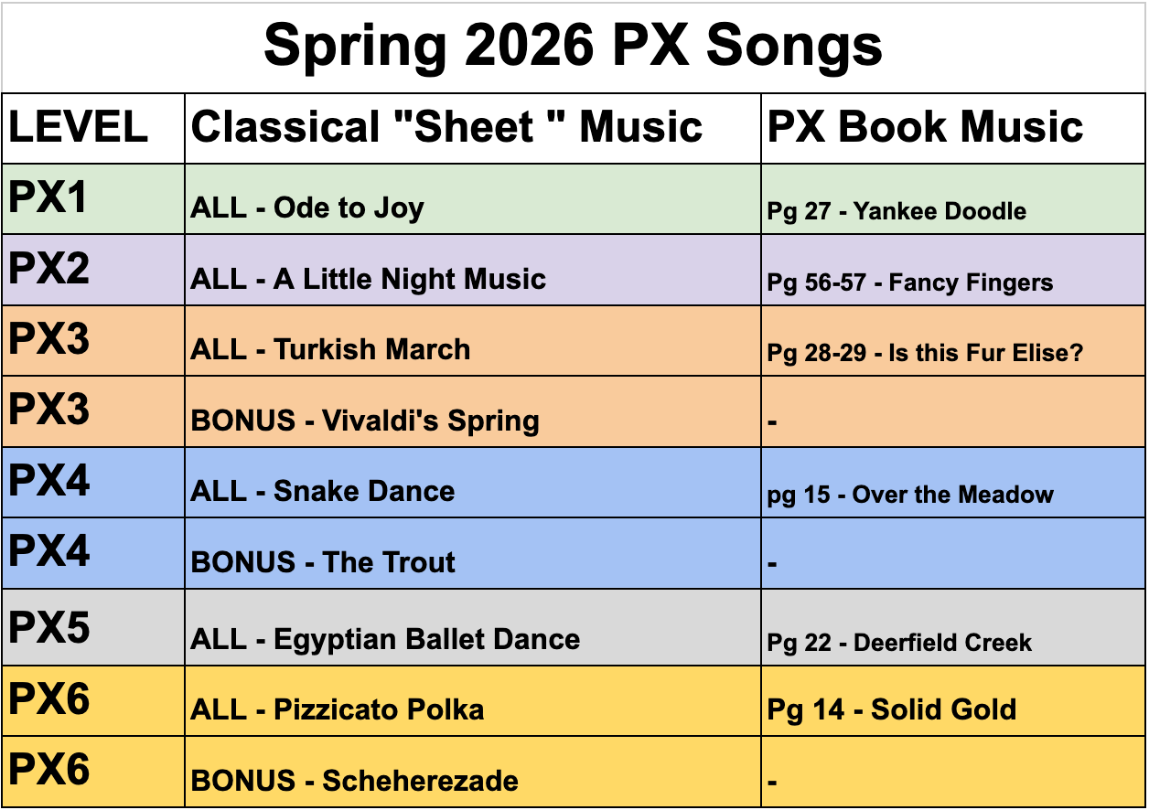 Group Piano Students (PX): An email is sent out in the first week of obtaining their music with a PDF of this information. Your students are given 2-3 songs to be working on (found in their binder):