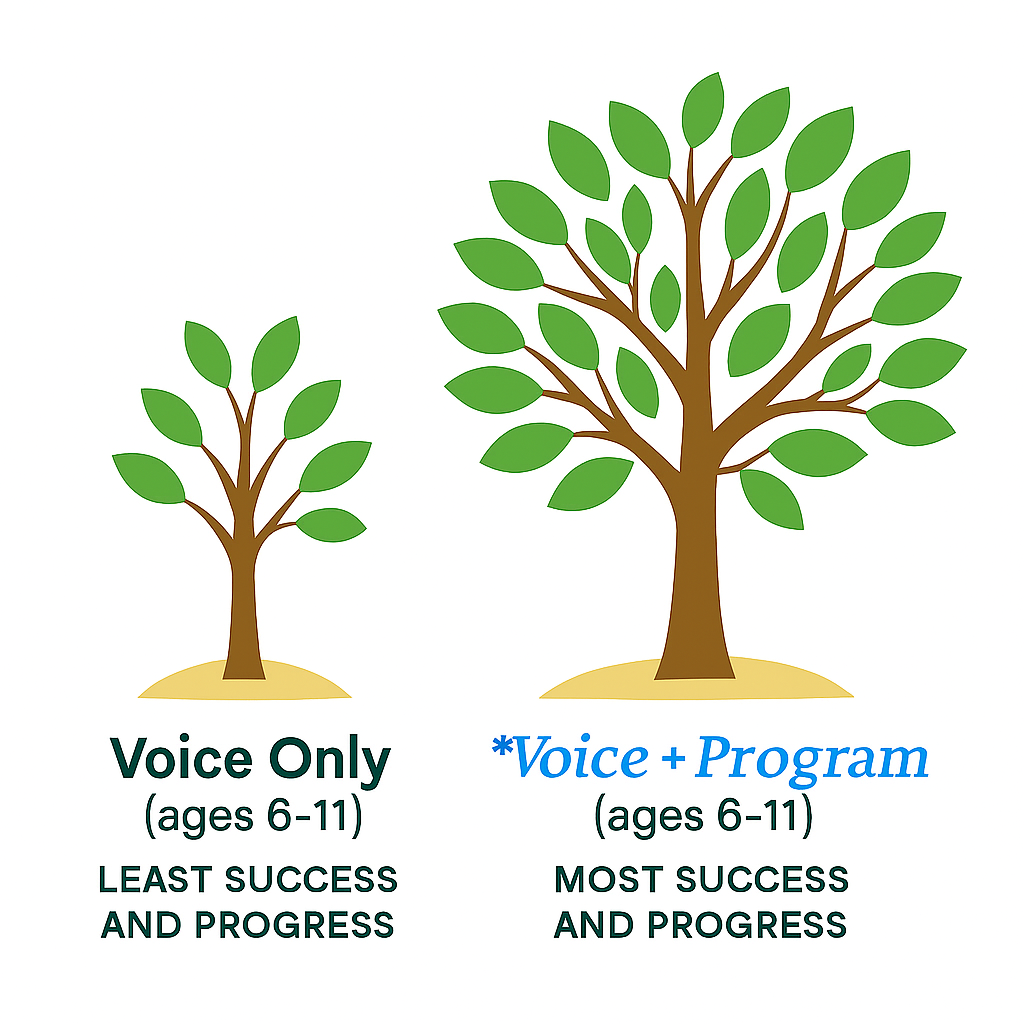 Children ages 6 - 11 that have had individual voice lessons with us have far and away been the least-successful, inspiring, and have had the least vocal progress of all of our students across all of our instrument types (voice, drum, guitar, and piano).